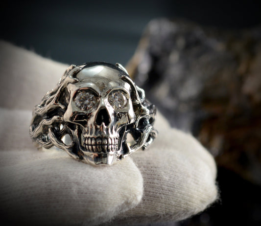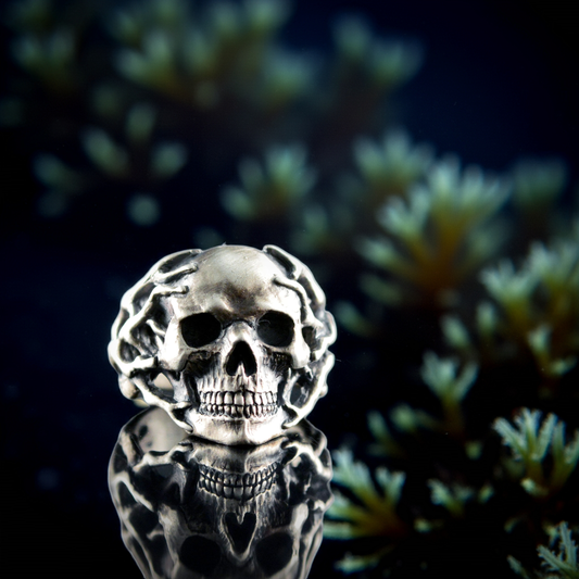 Totenkopfring aus 925er Silber für Damen oder Herren, Totenkopfring mit Korallenzweigen, handgefertigter Ring, silberner Bikerring