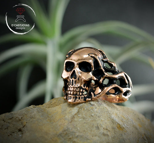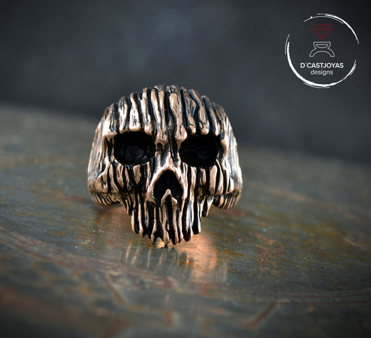Totenkopfring aus massiver Bronze, Ring mit Baumrindentexturen, Waldschädelring, Herrenschmuck, handgefertigt, Memento Mori