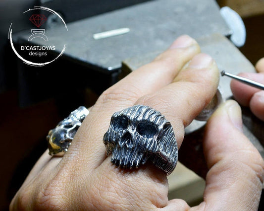 Totenkopfring aus massivem Silber, Ring mit Baumrindentexturen, Waldschädelring, Herrenschmuck, handgefertigt, Memento Mori