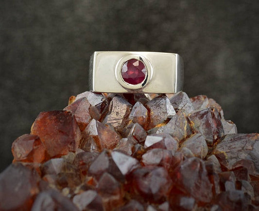 Massiver gerader Bandring aus Silber, Rubin-Solitärring, Herren-Ehering, handwerklicher Ring, handgefertigter Ring, zeitgenössischer Schmuck
