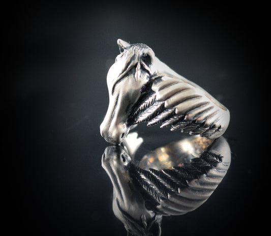 Handgefertigter geflügelter Pferdering aus Sterlingsilber, Pegasus-Ring, Pferdekopf mit natürlichen Edelsteinen