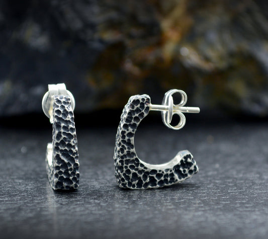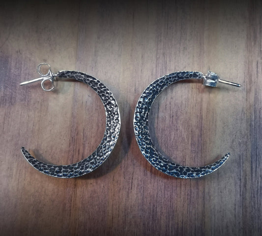 Halbmondförmige Creolen mit gehämmerter Textur und oxidiertem Finish, Creolen im modernen Stil, handgefertigt aus Sterlingsilber