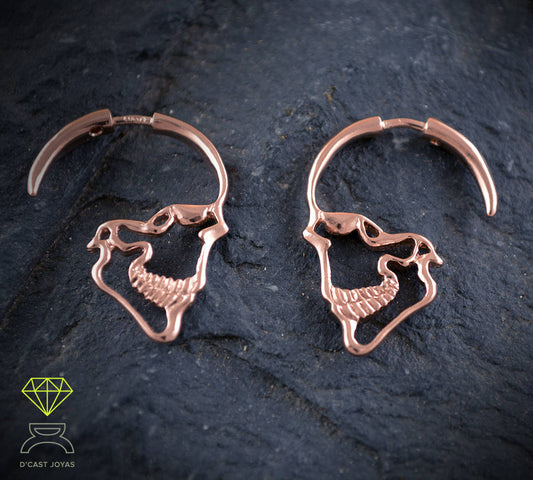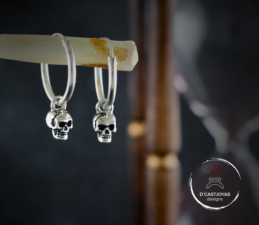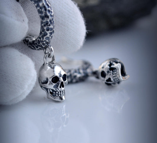 Aros de plata martillada con mini calavera. Joyería gótica y alternativa, hecha a mano. Perfectos para Halloween o diario.