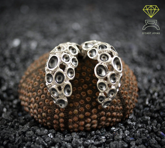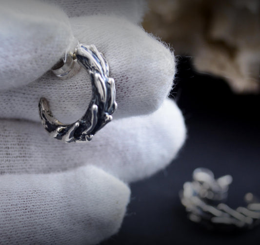 Aro pequeño rústico unisex en plata de ley, Diseño rama de coral hecho a mano