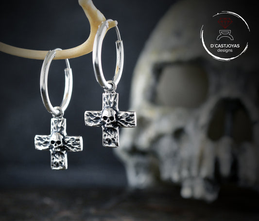 Rustikaler Kreuz- und Totenkopf-Creolen aus Sterlingsilber mit gehämmerten Texturen, Creolen für Männer und Frauen