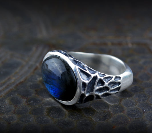 Anillo sello con labradorita ovalada y texturas armónicas, Edición Limitada