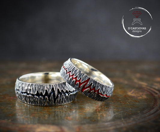 Rustikales Allianzen-Set, Herzschlag-Bandring aus 925er Silber