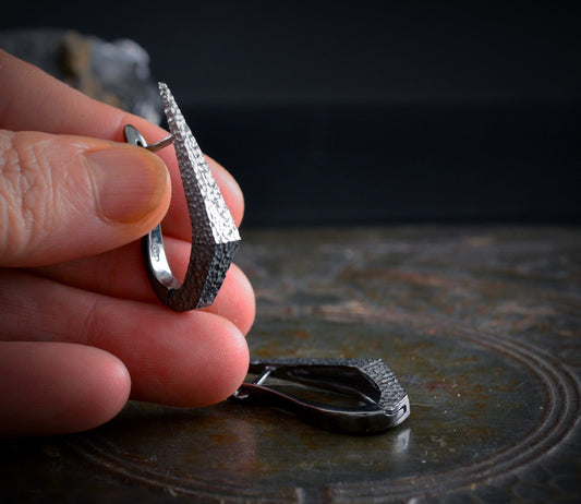 Silberne Dolchohrringe mit schwarzer Rhodiumbeschichtung und gehämmerter Textur, handgefertigter Ohrring