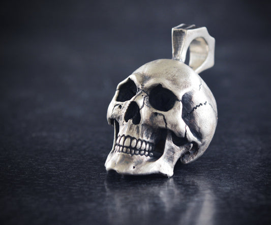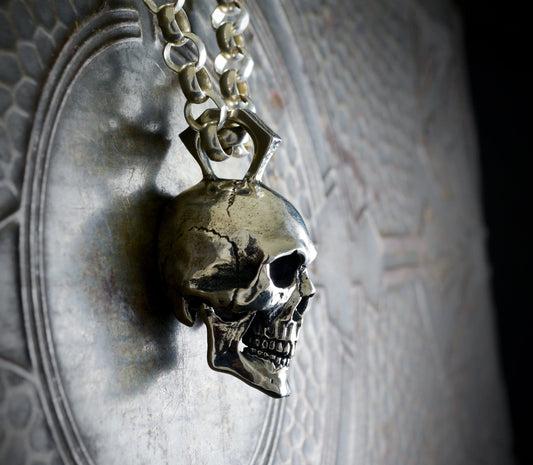Large handmade human skull pendant in sterling silver, Memento mori, Biker pendant