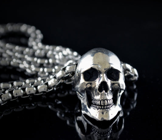 Large Human Skull Pendant, Sterling Silver Full Skull, Memento Mori, Biker Pendant