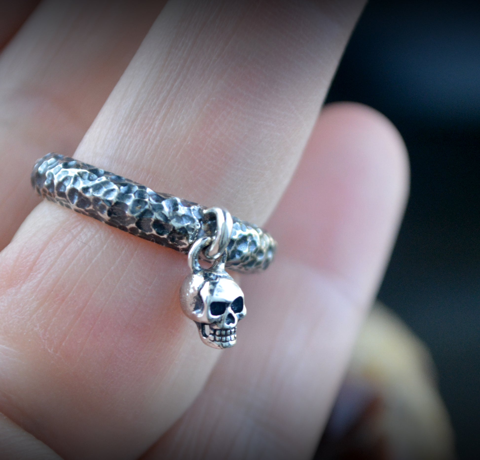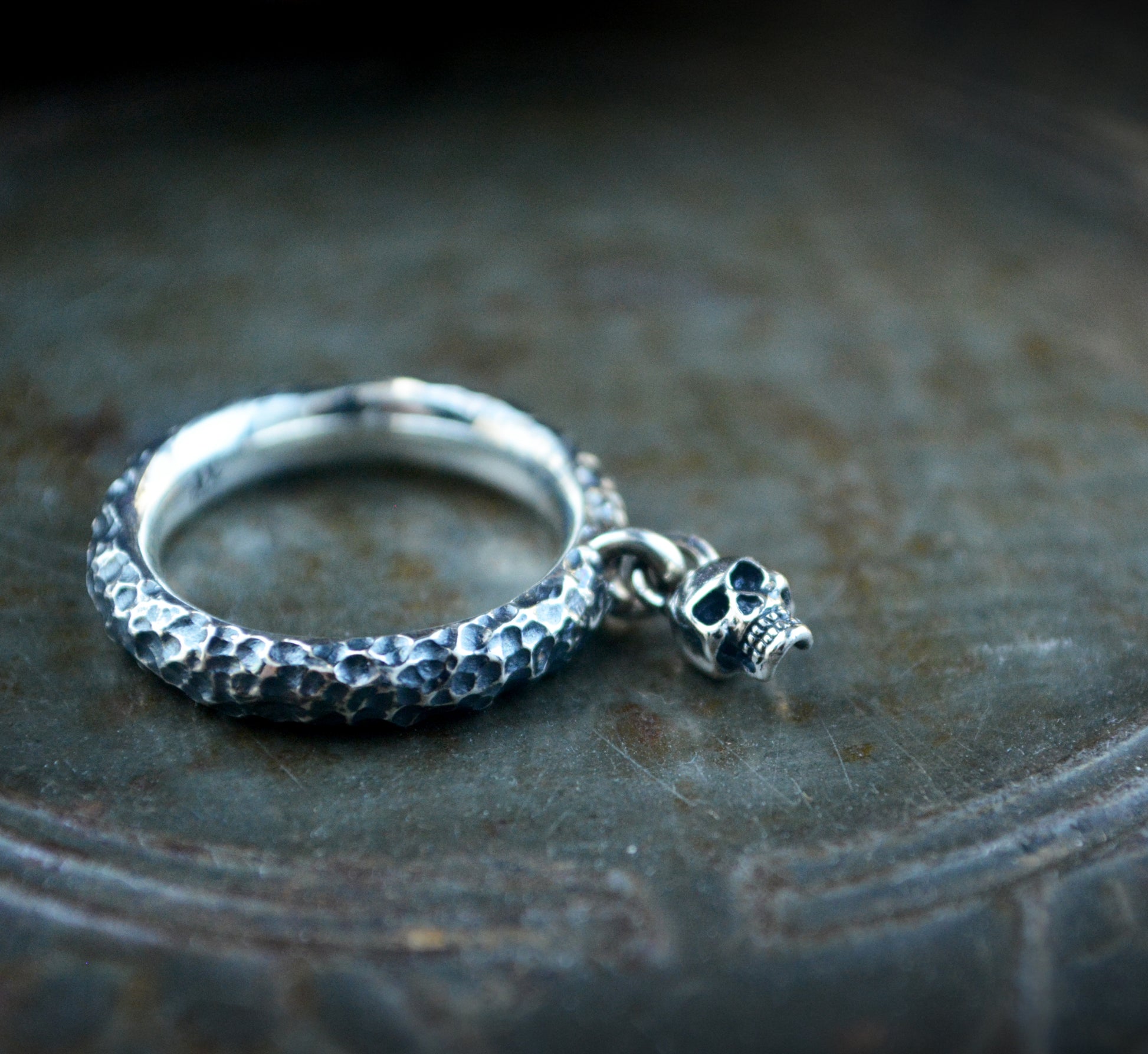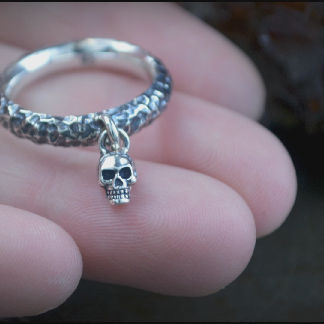 Del aro cuelga una pequeña calavera móvil, esculpida y acabada a mano.